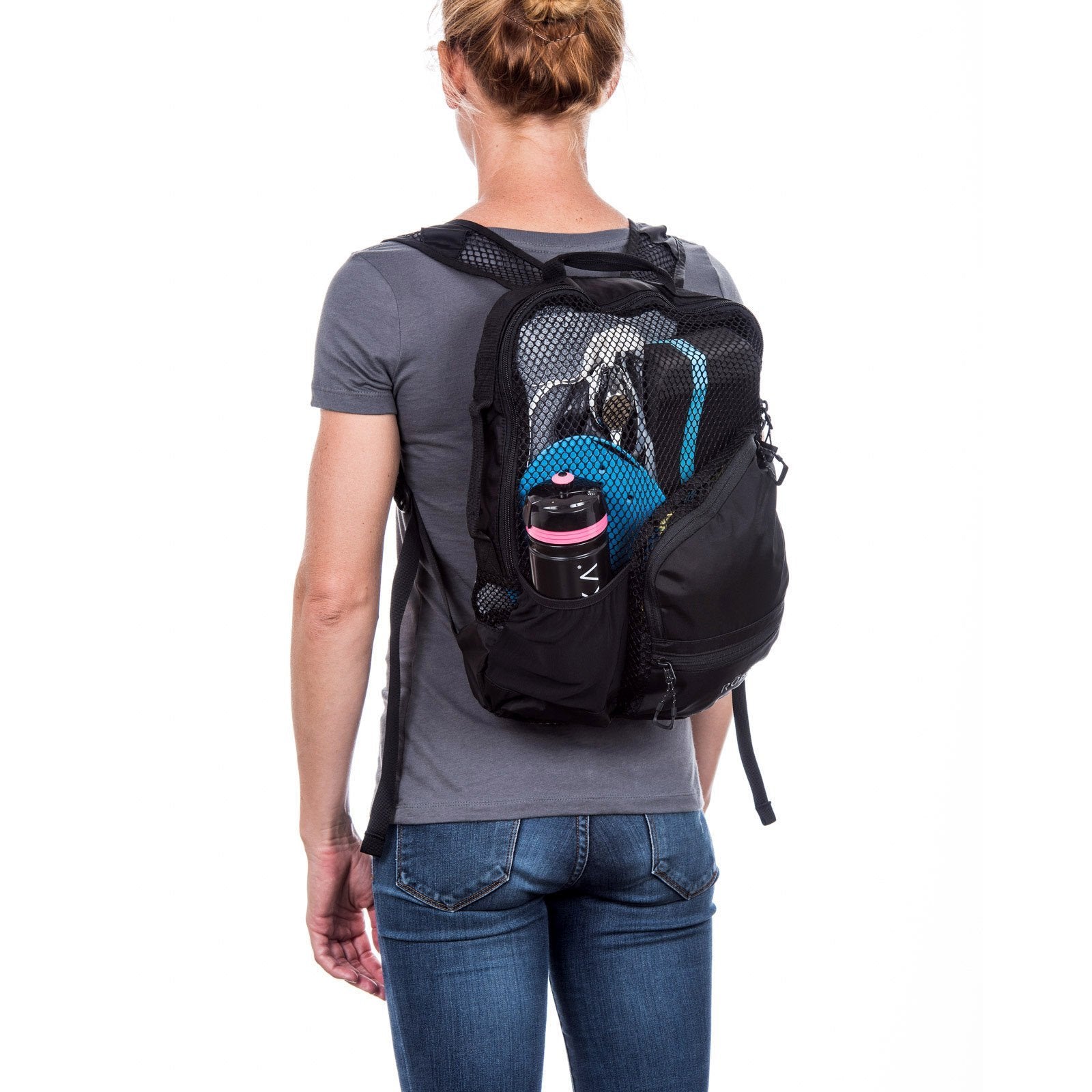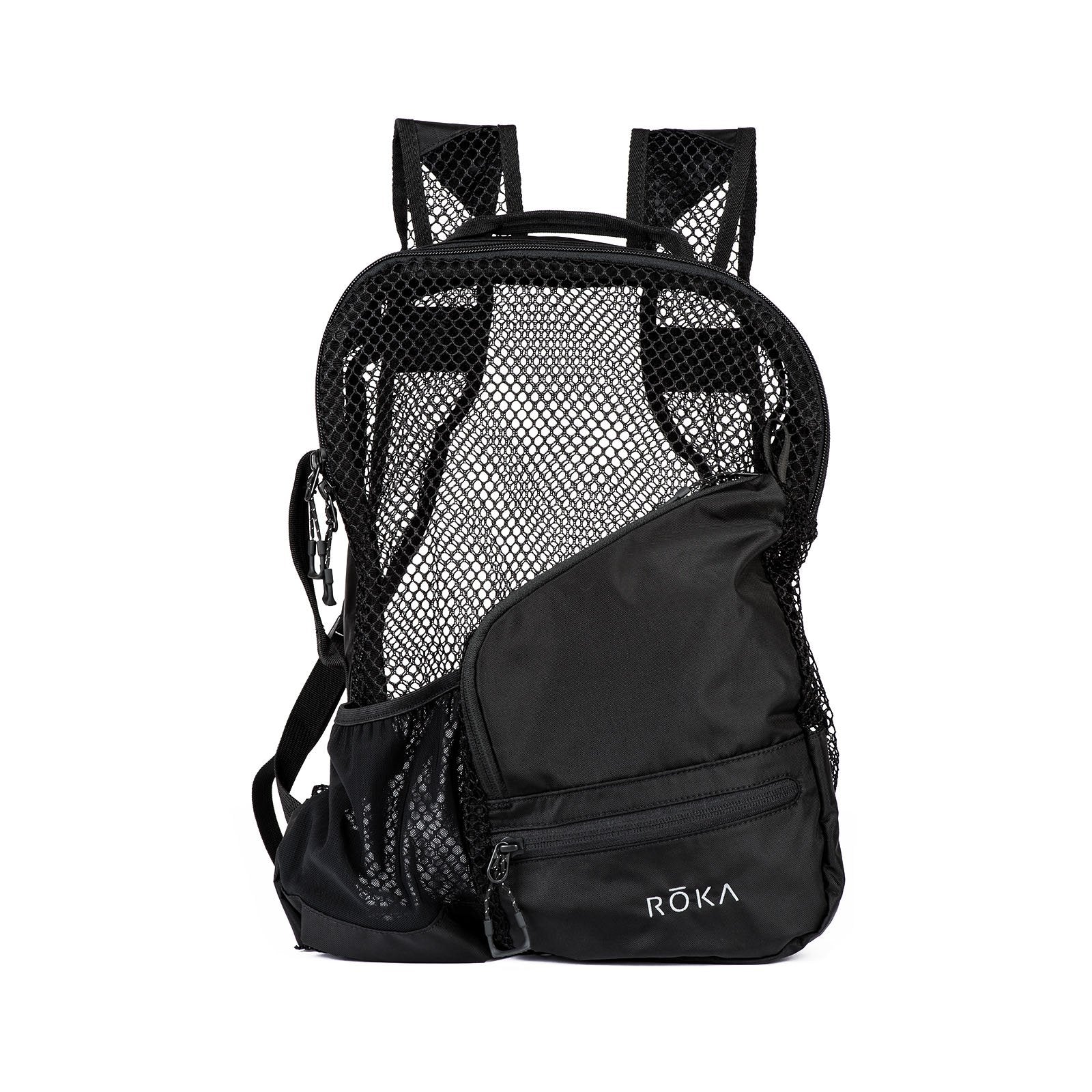 - Large front zip pouch with ventilated mesh back